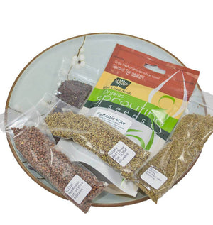 CERTIFIED ORGANIC! The Fantastic Four sprouting collection an excellent introduction to sprouting. It contains a selection of four of our most popular sprouts: Mild alfalfa, crunchy red clover and diverse salad blend, and spicy red radish. And they come individually packaged 40g at a time, so there's no big commitment to using up a giant quantity of seeds. Explore the wide range of flavours and sizes of sprouts, and then experiment with blending your own sprout mixes. These nutritious super-foods are ready to eat just four days after starting. The Fantastic Four sprouting collection makes a great gift.