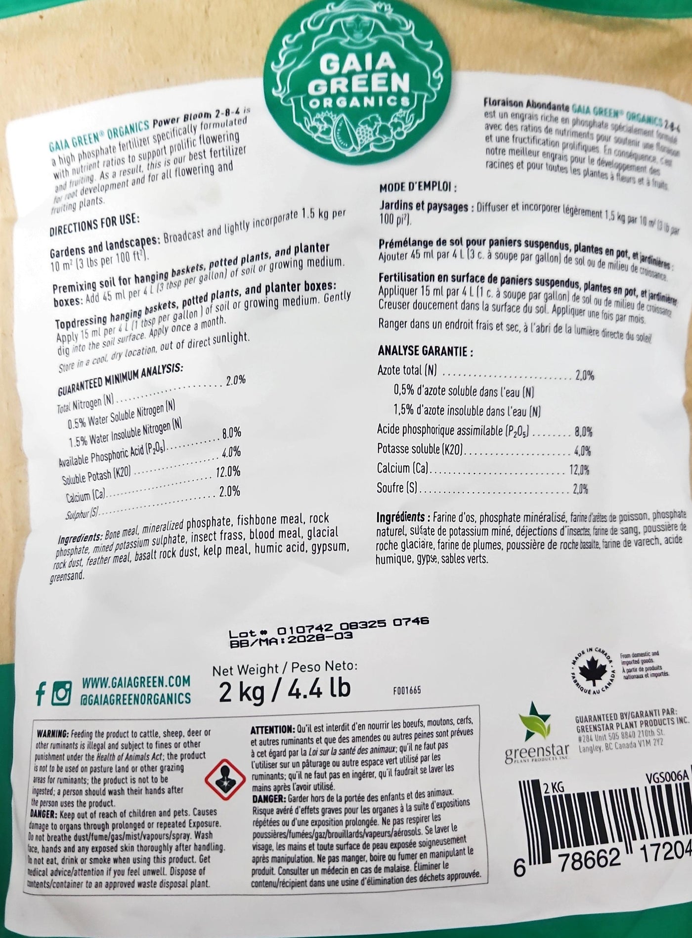 {"id":1295286698110,"title":"Gaia Green Power Bloom 2-8-4","handle":"gaia-green-power-bloom","description":"\u003cp\u003eGAIA GREEN Power Bloom is a high phosphate fertilizer specifically formulated to support prolific flowering and fruiting. As a result, GAIA GREEN Power Bloom is our best fertilizer for root development and for all flowering and fruiting plants.\u003c\/p\u003e\n\u003cul\u003e\n\u003cli\u003e\n\u003cp\u003eThis complex, multi-ingredient blend contains high phosphorus and potassium levels suitable for a wide range of flowering and fruiting crops.\u003c\/p\u003e\n\u003c\/li\u003e\n\u003cli\u003e\n\u003cp\u003eEmbodies the Gaia Green ethos of improving soil quality to support resilient plant growth and abundant, long lasting blooms.\u003c\/p\u003e\n\u003c\/li\u003e\n\u003cli\u003e\n\u003cp\u003eEasy-to-use and long-lasting, this formulation combines ingredients with variable nutrient release rates to support high-yields.\u003c\/p\u003e\n\u003c\/li\u003e\n\u003c\/ul\u003e\n\u003cp\u003e\u003cstrong\u003eGuaranteed minimum analysis:\u003c\/strong\u003e\u003cbr\u003e\u003c\/p\u003e\n\u003cp\u003e\u003cspan\u003eTotal Nitrogen (N)…..…….......…….….2.0%\u003c\/span\u003e\u003c\/p\u003e\n\u003cp\u003e\u003cspan\u003e0.5% Water Soluble Nitrogen (N).........0.5%\u003c\/span\u003e\u003c\/p\u003e\n\u003cp\u003e\u003cspan\u003e1.5% Water Insoluble Nitrogen (N).......1.5%\u003c\/span\u003e\u003c\/p\u003e\n\u003cp\u003e\u003cspan\u003eAvailable Phosphate (P₂O₅) ………..….8.0%\u003c\/span\u003e\u003c\/p\u003e\n\u003cp\u003e\u003cspan\u003eSoluble Potash (K₂O) …….…….….….4.0%\u003c\/span\u003e\u003c\/p\u003e\n\u003cp\u003eGAIA GREEN Power Bloom is approved for use in organic agriculture by Ecocert Canada (in compliance with Canada’s Organic Production Systems General Principles \u0026amp; Management Standards and Permitted Substances Lists (CAN\/CGSB 32.310-2015 and CAN\/CGSB 32.311-2015)).\u003c\/p\u003e\n\u003cp\u003e\u003cspan style=\"color: #2b00ff;\"\u003e\u003ca href=\"https:\/\/www.gaiagreen.com\/learning\" style=\"color: #2b00ff;\" data-mce-fragment=\"1\" data-mce-href=\"https:\/\/www.gaiagreen.com\/learning\"\u003e\u003cstrong data-mce-fragment=\"1\"\u003eGAIA GREEN learning information\u003c\/strong\u003e\u003c\/a\u003e\u003c\/span\u003e\u003c\/p\u003e\n\u003ciframe width=\"560\" height=\"315\" src=\"https:\/\/www.youtube.com\/embed\/O6s4iqfASa4\" title=\"YouTube video player\" frameborder=\"0\" allow=\"accelerometer; autoplay; clipboard-write; encrypted-media; gyroscope; picture-in-picture; web-share\" allowfullscreen\u003e\u003c\/iframe\u003e","published_at":"2018-05-14T13:58:29-06:00","created_at":"2018-05-14T14:00:12-06:00","vendor":"Hydrofarm","type":"Organics","tags":["bloom","bloom booster","dry","nute","nutes","nutrients","organic","Organics","powder","top dress"],"price":1395,"price_min":1395,"price_max":11995,"available":true,"price_varies":true,"compare_at_price":null,"compare_at_price_min":0,"compare_at_price_max":0,"compare_at_price_varies":false,"variants":[{"id":12094135926910,"title":"500g","option1":"500g","option2":null,"option3":null,"sku":"GAI-911","requires_shipping":true,"taxable":true,"featured_image":null,"available":true,"name":"Gaia Green Power Bloom 2-8-4 - 500g","public_title":"500g","options":["500g"],"price":1395,"weight":560,"compare_at_price":null,"inventory_management":"shopify","barcode":"678662175024","requires_selling_plan":false,"selling_plan_allocations":[]},{"id":12094135959678,"title":"2kg","option1":"2kg","option2":null,"option3":null,"sku":"GAI-910","requires_shipping":true,"taxable":true,"featured_image":null,"available":true,"name":"Gaia Green Power Bloom 2-8-4 - 2kg","public_title":"2kg","options":["2kg"],"price":3995,"weight":2000,"compare_at_price":null,"inventory_management":"shopify","barcode":"060865514814","requires_selling_plan":false,"selling_plan_allocations":[]},{"id":28070225150036,"title":"10kg","option1":"10kg","option2":null,"option3":null,"sku":"GAI-909","requires_shipping":true,"taxable":true,"featured_image":{"id":30624065487041,"product_id":1295286698110,"position":4,"created_at":"2021-08-24T14:39:06-06:00","updated_at":"2025-11-07T13:11:54-07:00","alt":null,"width":300,"height":300,"src":"\/\/hydro-lite.com\/cdn\/shop\/products\/D297F3C4-8921-4DDE-B84D-00D562AFD913.jpg?v=1762546314","variant_ids":[28070225150036,31155875643476]},"available":true,"name":"Gaia Green Power Bloom 2-8-4 - 10kg","public_title":"10kg","options":["10kg"],"price":6995,"weight":10000,"compare_at_price":null,"inventory_management":"shopify","barcode":"678662002108","featured_media":{"alt":null,"id":22895343763649,"position":4,"preview_image":{"aspect_ratio":1.0,"height":300,"width":300,"src":"\/\/hydro-lite.com\/cdn\/shop\/products\/D297F3C4-8921-4DDE-B84D-00D562AFD913.jpg?v=1762546314"}},"requires_selling_plan":false,"selling_plan_allocations":[]},{"id":31155875643476,"title":"20kg","option1":"20kg","option2":null,"option3":null,"sku":"GAI-908","requires_shipping":true,"taxable":true,"featured_image":{"id":30624065487041,"product_id":1295286698110,"position":4,"created_at":"2021-08-24T14:39:06-06:00","updated_at":"2025-11-07T13:11:54-07:00","alt":null,"width":300,"height":300,"src":"\/\/hydro-lite.com\/cdn\/shop\/products\/D297F3C4-8921-4DDE-B84D-00D562AFD913.jpg?v=1762546314","variant_ids":[28070225150036,31155875643476]},"available":true,"name":"Gaia Green Power Bloom 2-8-4 - 20kg","public_title":"20kg","options":["20kg"],"price":11995,"weight":20000,"compare_at_price":null,"inventory_management":"shopify","barcode":"678662002207","featured_media":{"alt":null,"id":22895343763649,"position":4,"preview_image":{"aspect_ratio":1.0,"height":300,"width":300,"src":"\/\/hydro-lite.com\/cdn\/shop\/products\/D297F3C4-8921-4DDE-B84D-00D562AFD913.jpg?v=1762546314"}},"requires_selling_plan":false,"selling_plan_allocations":[]}],"images":["\/\/hydro-lite.com\/cdn\/shop\/files\/1000002006.jpg?v=1762546001","\/\/hydro-lit